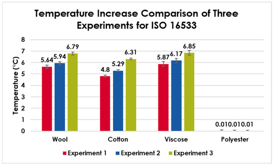These three experiments (E1, E2, E3) aimed to determine the optimal protocol for these exothermic tests to detect reliable and significant differences among different types of fiber. The experiments were focused on determining the effect of mass (increasing sample volume) and temperature sensor size. A larger sample (double) folded in the same area was expected to have a larger increase in temperature as measured by the sensor folded within the sample. The smaller temperature sensor was expected to have better intimate contact with the sample and thus better register the temperature changes. Figure 7 indicates that the three experiments on the same type of fabrics had increasing test results in terms of temperature increase. From E1, viscose fabrics had the highest temperature increase of 5.87 °C, while polyester had the lowest or almost no temperature increase. Cotton increased by 4.80 °C when switching the fabric from low to high humidity, while for wool, it was 5.64 °C. In addition, viscose had the highest temperature increase of 6.17 °C and 6.85 °C, respectively, for Experiment 2 and Experiment 3. In comparison, wool had an increase of 5.94 °C and 6.79 °C, and cotton had an increase of 5.29 °C and 6.31 °C, respectively, for E2 and E3. Polyester did not show any responses at all in the three experiments.