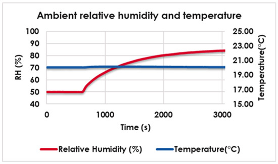 In this test, the change in the heat flux input of the increase in the hot plate as a function of the humidity is of interest. Fabrics generate heat as humidity increases; therefore, the hot plate’s heat flux input would be reduced to keep the temperature constant. The area of reducing heat flux over time represents the heat that is generated by the fabrics when they absorb moisture from the ambient environment. Since each fabric had a different thermal resistance, all heat flux curves were calibrated to the same baseline. The ambient temperature and RH are shown below in Figure 8. The ambient temperature was stable and well controlled, while the ambient RH took some time to increase. The chamber took 23 min to increase the RH from 50% to 80% and 40 min to reach 85%.