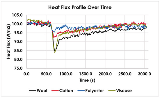 The change in the heat flux of the fabrics when ambient RH increased from 45% to 85% is shown in Figure 9. Each curve of the fabric samples showed 10 min (600 s) heat flux at a stable state and 40.8 min (the 2450 s) after an increase in RH. For all fabrics, a decrease in the heat flux could be observed, which means that the fabrics generate heat when switching the RH from low to high. The curves had some noise and fluctuation, especially at the end of each trial, which was caused by the slow increase in RH. Wool fabrics had a relatively larger peak than polyester fabrics and cotton fabrics. Viscose had a peak pattern close to wool fabrics. To further analyze the curve, the peak area was calculated for each fiber type.
