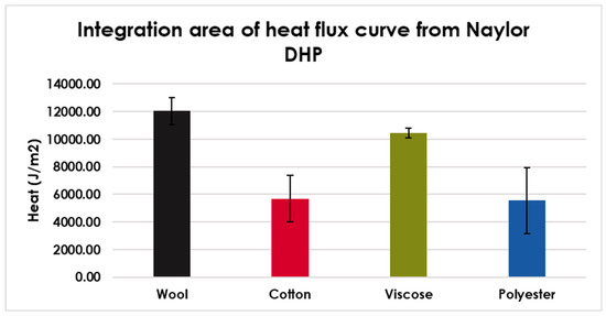 The integration of the heat flux peak over time is the heat generated by the fabrics. Figure 10 shows the integration results of the heat flux curves, and detailed heat release data are shown in Table 6. The average heat flux value for 10 min before switching RH was calculated as the baseline of steady state at 45% RH. The difference value between the baseline and each data point was determined and multiplied by the 10 s value as the data were recorded at every 10 s interval. The integration area obtained from the heat flux curve would be the heat release due to the humidity change. It is evident that wool and viscose had a higher heat release than cotton and polyester, and had significant differences.