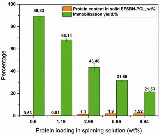 EFSBN-PCL web immobilization yield was calculated using Equation (2), where is the measured protein content in the solubilized EFSBN webs and is the theoretical protein loading (amount of protein added) in the spinning solution.