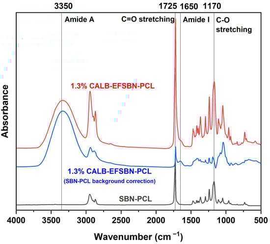 FTIR was used to confirm the presence of CALB in the solution blown nanofiber webs (Figure 3). Infrared absorbance of PCL exhibited a main peak at 1725 and 1170 cm−1 due to C=O stretching and C-O-C stretching, respectively [47,48]. The N-H stretching peak of amide A from enzyme protein overlaps with O-H stretching from water, resulting a broad peak at 3100–3500 cm−1 [49]. Some bound water molecules are associated with the enzyme structure [50], while additional water may be present from using a water-in-oil emulsion spinning solution to entrap enzymes inside individual fibers of the nanofibrous webs. Due to the low protein content (1.3% in the EFSBN-PCL webs), the characteristic amide I (1650 cm−1) and amide II (1550 cm−1) peaks of peptide bonds [51] are very small in EFSBN-PCL. However, the amide I peak intensity increased when a background correction using SBN-PCL webs was performed. Dry enzyme-free SBN-PCL webs do not exhibit peaks in this region. These results are consistent with reports where FTIR analysis confirmed lipase entrapment inside a polymer matrix by observing similar peaks [52].