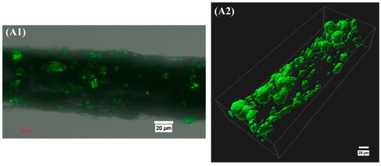 Laser scanning confocal microscopy images of the distribution of FITC-tagged CALB (0.32 wt%) entrapped in EFSBN-PCL webs: (A1) raw image and (A2) z-series image. Green represents the quantity of enzyme distribution throughout the web.