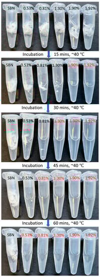 Degradation studies of EFSBN-PCL webs were carried out using a batch process. SBN-PCL and EFSBN-PCL webs (~15 mg) were placed in 1500 µL microcentrifuge tubes containing 1000 µL Tris-HCl buffer solution (100 mM, pH 8.0). Incubations were performed with manual shaking (every 5 min intervals) in a dry bath incubator (Isotemp, Fisher Scientific) at 40 °C. All tubes were removed from the incubator every 15 min to take a visual picture and then placed in the incubator. The whole incubation process time was 60 min. Degradation studies of EFSBN-PCL webs at room temperature incubation were also observed in comparison to SBL-PCL webs and original PCL beads. PCL beads, SBN-PCL webs, and EFSBN-PCL webs (~30 mg) were immersed in microcentrifuge (2000 µL) tubes containing Tris-HCl buffer (1500 µL). For the PCL beads and SBN-PCL webs, free CALB was added to the buffer. The microcentrifuge tubes were then placed in tube holders at room temperature (~22 °C) for 4 h, and a picture was taken for visual comparison. For morphological analysis of degraded webs, fibers were removed from microcentrifuge tubes after 30 min incubation, dried, and stored for SEM analysis.