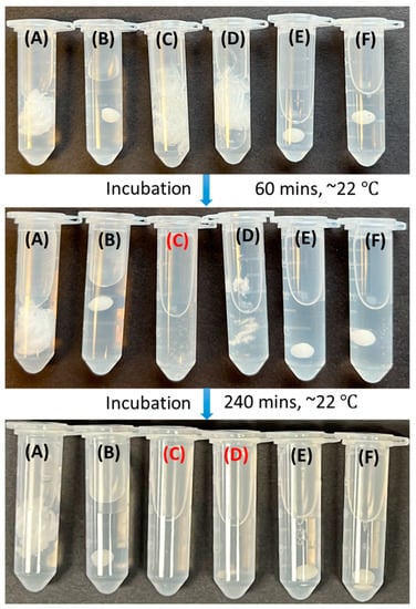 Enzymatic degradation of SBN-PCL, EFSBN-PCL and PCL bead in a Tris-HCl buffer (pH 8.0, 100 mM) at ambient conditions (~22 °C) for samples: (A) SBN-PCL in buffer, (B) PCL-bead in buffer, (C) 1.30 wt% CALB-EFSBN-PCL in buffer (0.238 mg protein CALB loading/mL buffer), (D) SBN-PCL in free CALB (50-times dilution) in buffer (0.232 mg protein CALB loading/mL buffer), (E) PCL-bead in free CALB (50-times dilution) in buffer (0.232 mg protein CALB loading/mL buffer), and (F) PCL-bead in free CALB (10-times dilution) in buffer (1.192 mg protein CALB loading/mL buffer). Top image shows the initial appearance of the samples; middle image shows the samples after 1 h incubation, where sample (C) is almost fully degraded; and, bottom image shows that both samples (C) and (D) are fully degraded after a total of 4 h incubation.