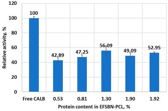 CALB-loaded EFSBN-PCL webs were entirely degradable in pH 8 buffer after incubation at 40 °C, which released CALB into the buffer as a free enzyme that could respond to lipase activity analysis. Released CALB activity was calculated relative to the amount of protein detected in the solid webs. Then, the percent relative activity of EFSBN webs was calculated from the ratio of degraded EFSBN-PCL webs activity compared to the activity of an equivalent amount of free enzyme protein. The lipase activities of CALB-EFSBN-PCL webs relative to their measured protein content are presented in Figure 8. The EFSBN-PCL showed around 50% retained catalytic activity, indicating that the enzyme delivered through the solution-blowing nozzle still retained a useful level of activity in the final solid web products. This level of catalytic activity also indicated that at least some immobilized CALB retained its functional structure in the PCL–chloroform solution or was able to recover its functional structure when the webs were exposed to buffer solution. Other factors, such as vigorous vortex mixing during emulsion preparation, together with solvent exposure and the stress of solution blowing, could lead to protein denaturation, which would explain the loss of hydrolytic activity. Nevertheless, the amount of retained activity was comparable to the activity of a free Candida rugosa lipase that was incubated in an anhydrous chloroform solvent [53]. The substantial retained activity of CALB indicates that the solution-blown spinning process is a promising technique for entrapping lipase inside PCL carriers from a PCL-organic solvent solution.