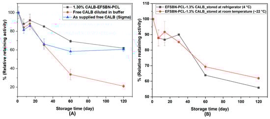 (A) Ambient (~22 °C) storage stability of supplied free CALB, diluted free CALB (0.1 µL/mL) in Tris HCl buffer (pH = 8.0, 100 mM) and 1.30 wt% CALB-EFSBN-PCL solid webs and (B) Storage stability (retaining activity with time) of 1.3 wt% CALB-EFSBN-PCL webs at ambient and refrigerator temperatures.