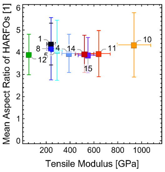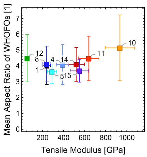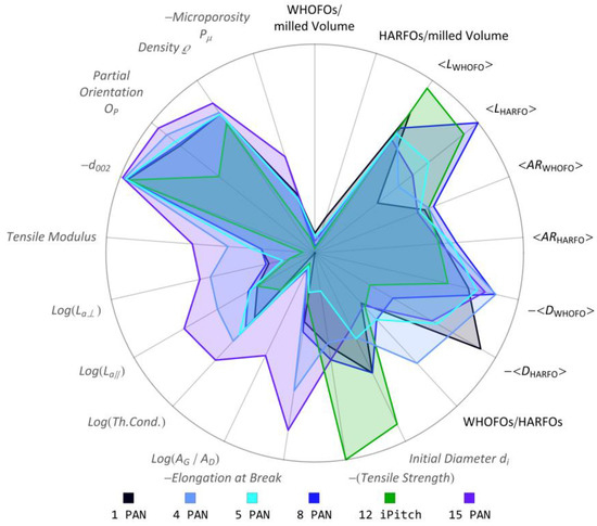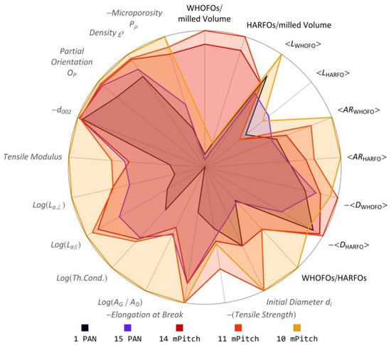 The investigated fibers 1, 4, 5 and 8 are typical panCFs within the range of common properties for such fibers. Fiber 15 is a panCF that was not commercially available on the European market. In terms of mechanical properties, panCF 15 is similar to mPitchCFs 14, a fiber at the lower end of the mPitchCF property range. Fiber 11 is an average mPitchCF, while fiber 10 is a high-end mPitchCF achieving very high tensile modulus and thermal conductivity. Fiber 12 is based on isotropic pitch.