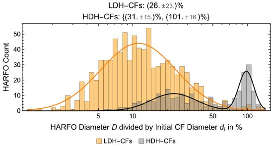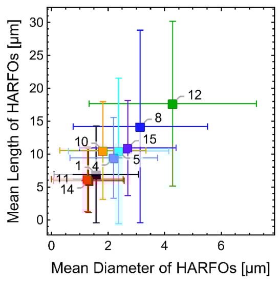 LARPOs and HARFOs of approximately the original fiber diameter in one direction were referred to as “Chunks” (HARFCs or LARPCs). They are assumed to be the result of a cleanly broken carbon fiber, whereas “Splinter”-like fragments with a diameter below the original are referred to as HARFSs. A standard error of 10% was assumed on the CF original diameter to test for width similarity.