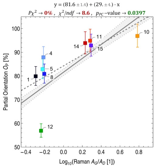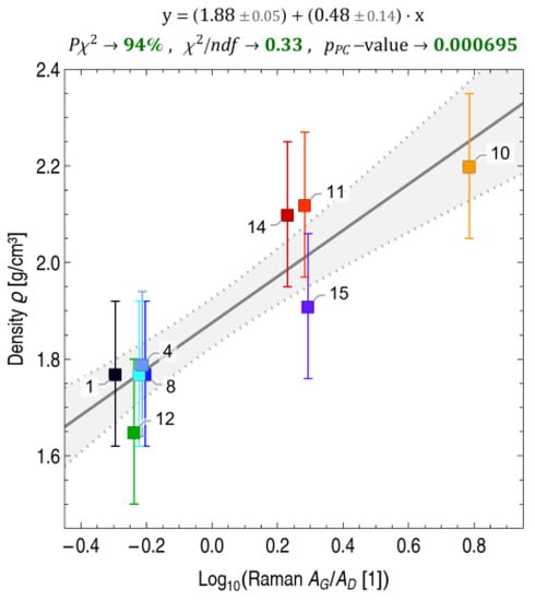 Table 4 summarizes the results of the deconvolution of Raman spectra to extract G/D peak intensities and area ratios, see Figure 1 and the Supplementary Information for more details. The order of the CF materials in Table 4 is the same as in Table 2. The G peak at about 1580 cm−1 is a common feature of sp2-bonded carbon systems and is found in (partly) graphitic materials. The D peak at about 1360 cm−1 is a feature observed in sp3-bonded carbon systems and indicates disordered or amorphous regions with defects and crystal boundaries [60]. In the literature, both the peak intensity IG/ID and the area ratio AG,BWF/AD are interpreted as measures of graphitization. The area ratio is more difficult to determine but allows correction for contributions to IG from a D’ band appearing at about 1620 cm−1.