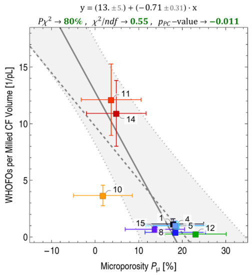 Thermal volume conductivity qT is generally not a key property for panCF applications. It is usually specified by the manufacturers mostly for pitchCFs. As we had no possibility to measure it, some thermal conductivity values of panCFs were missing. However, the high linear correlation observed between the electrical volume conductivity qE and the thermal volume conductivity qT with a Pearson correlation coefficient of 0.999 was used to interpolate the missing thermal values for panCFs 5, 8 and 15 from the known values of the other CFs by applying the formula qT = (qE⋅1284.8 W·µΩ/K − 58.2 W/m/K), see Figure S2 in the Supplementary Information. For the CF materials studied, sufficiently small crystalline domains with LC < 30 nm apparently cause only small phonon-related heat transfer effects that lead to deviations from linearity and justify this approach.