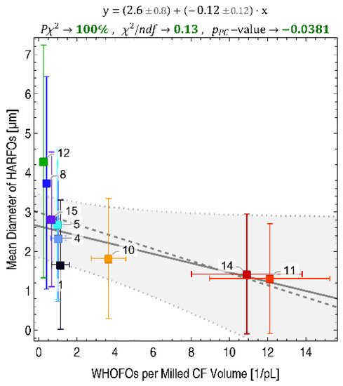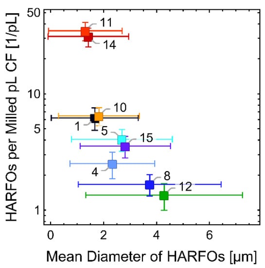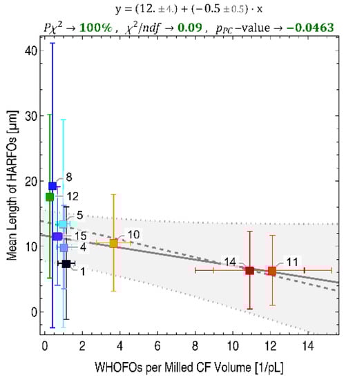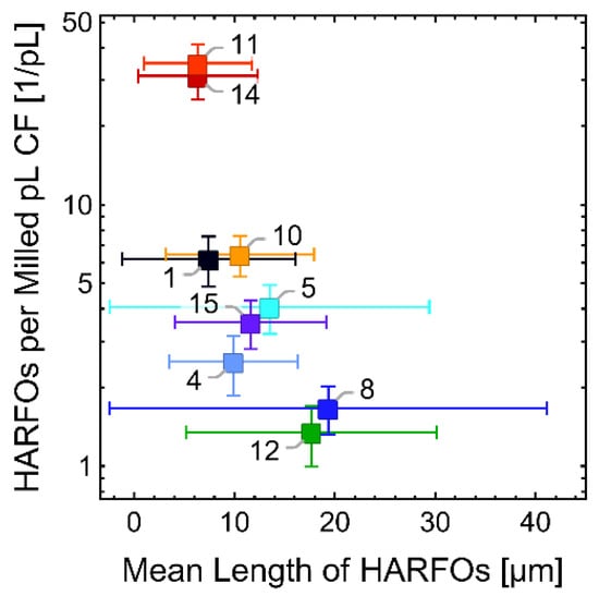 Using the specific density and the initial CF diameter , the resulting number of objects counted in a specific morphological category after images have been evaluated is normalized to the evaluated milled CF length , or to the evaluated milled CF mass in in the following. The length of CFs required to be milled to form 10,000 WHOFOs will also be referred to, see the ‘Discussion’ section.