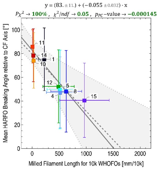 Based on the fragment shapes and morphologies as imaged by SEM, Ref. [7] assumed that mPitchCF preferentially formed fragments in the direction of the CF axis. To test this hypothesis, the maximum allowed fracture angle of a fragment was defined as , using the ratio of the initial CF diameter and the measured fragment length , see Section 4.4.3. For fragments shorter than the initial CF diameter, this hypothetical fracture angle was set to φ = 90° as they do not support the assumption that the CF disintegration occurred with a directional component parallel to the fiber axis.
