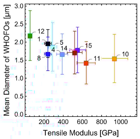Figure 2 shows examples of cross-sectional SEM-micrographs of some characteristic CF types. The only panCF in this micrograph, panCF 4, shows a granular microstructure typical of panCFs. This is consistent with the small crystallite sizes derived from the XRD-measurements. The isotropic pitchCF 12 in Figure 2 likewise shows a granular structure. The mPitchCFs 10, 11 and 14 show a very different, highly lamellar microstructure. Their high anisotropy is consistent with their significantly higher crystallite dimensions perpendicular () and parallel () to the fiber axis. Fiber 11 is distinguished by an extremely radial orientation of these lamellae, which was not observed in the other mPitchCF materials. The cross section image of this specimen of mPitchCF 11 in Figure 2 shows a “missing-piece-of-the-cake” defect, sometimes also called a “Pac Man” defect. Such defects are known to form in highly graphitized materials partly already during fiber synthesis as a result of a relaxation of internal stresses due to high fiber volume loss during graphitization. The manufacturer of mPitchCF 14 claimed to use a pitch stirring process during yarn spinning to reduce such defects [61,62]. The lamellae of the mPitchCF 14 sample appear to be less radially oriented than those of the mPitchCF 10 and 11 specimen.