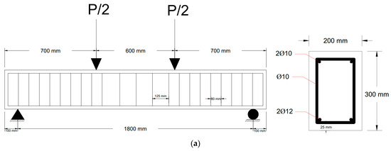 All of the tested beams had the same dimensions (200 mm × 300 mm × 2000 mm) and reinforcement type. The simply supported beam was subjected to a two-point load during the test. After damage induction, all beams in the EBR group were strengthened with an external CFRP strip with a width of 5 cm and length of 170 cm that was glued to the bottom face of the beam, while the beams in the NSM group were strengthened via the NSM technique, using two CFRP strips with a width of 2.5 cm and length of 170 cm that were glued inside the concrete cover of the bottom face of the beam (2.5 cm). The steel bars used to reinforce all of the beams were 2Ø12 at the bottom and 2Ø10 at the top, with stirrup Ø10 spacing of 80 mm near the support and 125 mm at the middle part of the beam; the concrete cover was 2.5 cm. Figure 1 shows the beam’s cross-section, reinforcement, and CFRP strengthening.