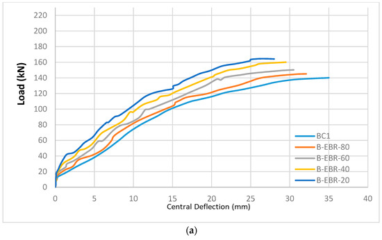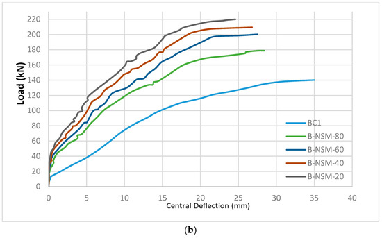 When the reference beam was at the ultimate load (140.1 kN), the mid-span deflection decreased by 24.8, 37.9, 43.4, 50.3, 57.7, 66.8, 74, and 76.9% for B-EBR-80, B-EBR-60, B-EBR-40, B-EBR-20, B-NSM-80, B-NSM-60, B-NSM-40, and B-NSM-20, respectively, with regard to the reference beam, BC1.