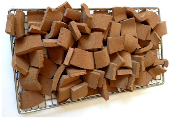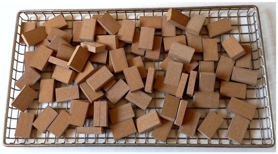 MDF panels were processed into samples with dimensions similar to those of pulp chips—approximately 10 mm wide, 20 mm long, and 8 mm thick (Figure 2).