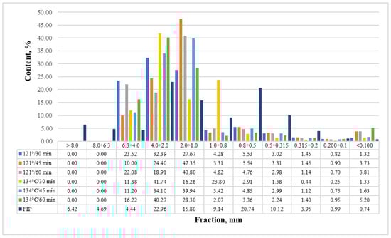 Data on the fractional composition of the recycled and fibers from industrial pulp are presented in Figure 4. As a result of the research on the fractional composition of the recycled fibers, it was found that their main fractions were from 4.0 mm to 1.0 mm. No significant difference in this distribution was observed for the studied hydrolysis regimes. In the analysis of the smallest fraction, below 100 μm, an increase in its amount was found when the hydrolysis time was increased from 30 to 60 min. The hydrolysis performed at a temperature of 134 °C for 60 min produced the most significant waste fraction. The share of the small fraction in this regime was nearly five times greater than in the fibers obtained at the hydrolysis temperature of 121 °C and a processing time of 30 min.
