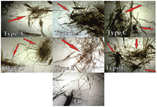 Microscopic images (×32) of recycled (Type A to Type F) and industrial pulp fibers.