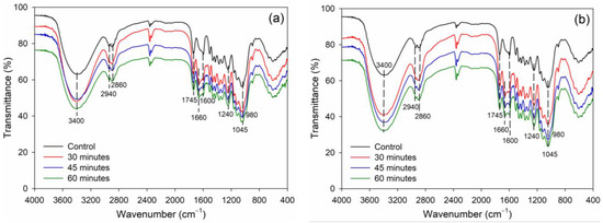 Functional groups analysis of recycled MDF fibers after hydrolysis at different temperatures and times: (a) 121 °C, (b) 134 °C.