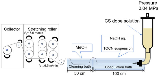 TOCN/CS composite fibers were prepared according to the method described by [25]. CS (10 g) was added to 240 g of a 2% w/v acetic acid solution to prepare a 4% w/w CS solution. The solution was stirred using a Hyper Stirrer System DxII (AS ONE Corporation, Tokyo, Japan) at a stirring speed of 200 rpm until the solution became homogenous. The solution was then filtered through a cotton cloth, packed in a column, and allowed to stand for 1 d. The defoamed solution was then used as the dope solution. Figure 1 shows a schematic of the wet-spinning equipment. Spinning was performed using a coagulation solution (2% w/w NaOH and 0.1% w/w TOCN) in the first bath and methanol as a cleaning agent in the second bath. After spinning, the fibers were washed with fresh methanol every 24 h for 5 d until the pH reached 7. Finally, the fibers were air-dried for 1 d to obtain TOCN/CS composite fibers.