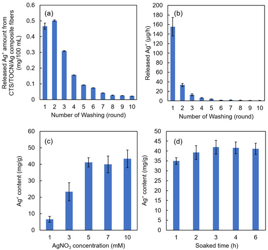 (a) The amount of Ag+ released from the Ag/TOCN/CS composite fibers in relation to the number of washes. (b) The release rate of Ag+ from the Ag/TOCN/CS composite fibers in relation to the number of washes. (c) The relationship between the Ag+ content in the Ag/TOCN/CS composite fibers and the initial concentration of the AgNO3 used for soaking. (d) The relationship between the Ag+ content in the Ag/TOCN/CS composite fibers and the soaking time.