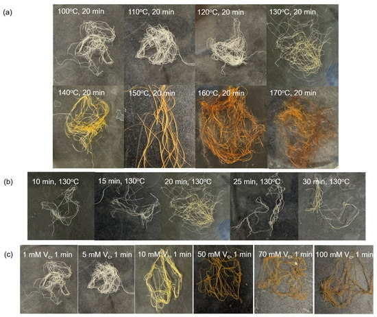 Appearance and color changes of the AgNP/TOCN/CS composite fibers obtained from (a) heat treatment at different temperatures, (b) heat treatment at different durations, and (c) reduction at different ascorbic acid concentrations.