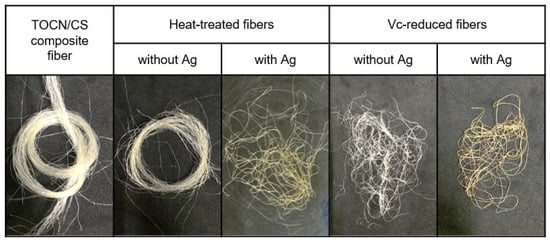 Based on the above results, AgNPs were probably formed on the fiber surface. A schematic illustration of the preparation route for the AgNP/TOCN/CS composite fibers is shown in Figure 7. First, the CS dope solution was pressurized through a 30-hole nozzle and coagulated with an aqueous solution comprising 0.01% TOCN and 2% NaOH. This step yielded the CS fibers coated with TOCN when the CS cation reacts with the TOCN anion via an electrostatic reaction. Second, the TOCN/CS fibers were soaked in an AgNO3 aqueous solution. In this step, the anions on the surface of the TOCN/CS fiber reacted with Ag+, and excess Ag+ was removed from the Ag/TOCN/CS fiber surface. Finally, the Ag+ in the Ag/TOCN/CS fibers was reduced to Ag0 via the ascorbic acid reduction, yielding the AgNP/TOCN/CS fibers. During heat treatment, the reducing agent was probably TOCN, whereas, during ascorbic acid reduction, TOCN and ascorbic acid were presumed to be the reducing agents [30,31,32]. The involvement of the carboxylic groups of TOCN molecules in the direct reduction of Ag+ has been reported [24].
