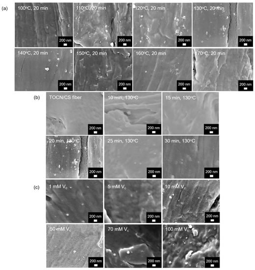 FE-SEM micrographs of the AgNP/TOCN/CS composite fibers obtained from (a) heat treatment at different temperatures, (b) heat treatment at different durations, and (c) reduction at different ascorbic acid concentrations.