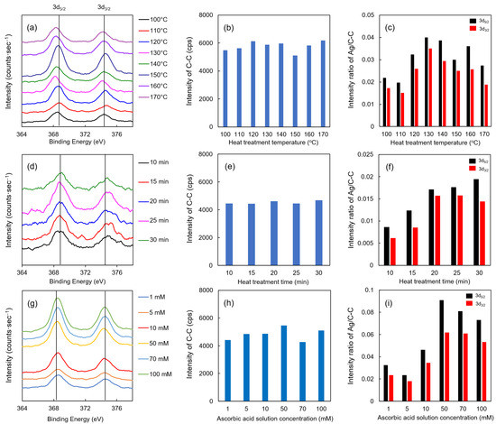 The XPS results of each Ag/TOCN/CS composite fiber are shown in Figure 6. Upon evaluating the effect of heat treatment temperature on the fibers, the binding energies of the Ag 3d5/2 and 3d3/2 orbital peaks were observed at all temperatures (Figure 6a). These binding energies had the same peaks as a standard Ag particle, implying that Ag was present on the fiber surface. However, no significant changes were observed between the different heat treatment temperatures. The intensity of carbon (single bond) can be stably detected at the time of measurement (Figure 6b,e,h); therefore, the intensity ratio of Ag to C–C was also demonstrated in this study. As shown in Figure 6c, the intensity ratio of Ag to C–C was the highest at 130 °C then gradually decreased beyond that temperature. This result suggests that the optimum temperature for heat reduction is 130 °C, where the binding energy is closest to the standard substance Ag. When the heat treatment was extended, higher intensities of the Ag 3d5/2 and 3d3/2 orbital peaks were observed (Figure 6d,f). However, no significant change was observed when heat treatment was applied for more than 20 min. Moreover, no relationship between the concentration and binding energy was found for ascorbic acid reduction. In contrast, when evaluating the relationship of the Ag to C–C intensity ratio to the ascorbic acid concentration, the highest ratio was observed when the concentration of the ascorbic acid solution was 50 mM (Figure 6g,i). Collectively, these results suggested that the optimum treatment condition, which was the highest intensity ratio of Ag to C–C, for heat treatment was 20 min at 130 °C, and the optimal treatment condition for ascorbic acid reduction was 1 min with 50 mM of ascorbic acid.