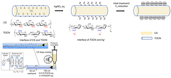 A schematic illustration of the preparation of AgNP/TOCN/CS composite fibers.