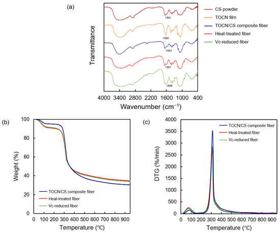 (a) FT-IR spectra of the CS powder, TOCN film, TOCN/CS composite fiber, heat-treated fiber, and Vc-reduced fiber. (b) TGA curves and (c) differential thermogravimetric curves of the AgNP/TOCN/CS composite fibers.
