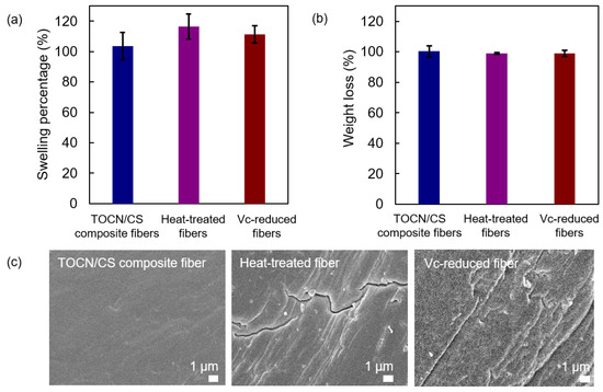 The swelling percentage and the remaining weight percentage after the swelling test of each sample are shown in Figure 10a and Figure 10b, respectively. The swelling percentages of the heat-treated fibers were similar to those of the Vc-reduced fibers and slightly higher than those of the TOCN/CS composite fibers. The high swelling percentages of the heat-treated and Vc-reduced fibers correspond to the cracks found on the surface of the fiber after heat treatment and ascorbic acid reduction, respectively (Figure 10c). In our experiments, the TOCN/CS composite fibers were immersed in an AgNO3 aqueous solution. After soaking, the aqueous solution was absorbed and remained inside the fibers. When the fibers dried, the swollen fibers shrank, suggesting that cracks were generated on the fiber surface after drying. Regarding the remaining weight percentage after the swelling test, the differences in the elution of each sample cannot be confirmed.