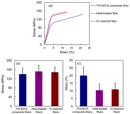 Figure 11 shows the tensile properties of the samples. The stresses of TOCN/CS composite, heat-treated, and Vc-reduced fibers were 140.7 ± 26.24, 152.4 ± 26.10, and 149.1 ± 21.80 MPa, respectively. The stress of the heat-treated fibers was slightly higher than that of the Vc-reduced fibers and significantly higher than that of TOCN/CS composite fibers. However, the strain of TOCN/CS composite fibers decreased from 20.0 ± 5.47% to 10.5 ± 4.14% and 11.0 ± 4.15% after heat treatment and ascorbic acid reduction, respectively. The strain values decreased because the fibers swelled once and shrank during drying, increasing their rigidity.