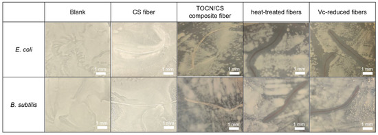 The antibacterial test method used in this study was according to JIS L 1920. The inhibition zones using the CS, TOCN/CS composite, heat-treated, and Vc-reduced fibers against two types of bacteria, E. coli and B. subtilis, compared with a blank (no fiber), are shown in Figure 12. The average of the inhibition zone from triplicate tests is shown in Table 1. The inhibition zones were not observed against E. coli and B. subtilis when CS fiber and TOCN/CS composite fibers without AgNPs were used. However, antimicrobial activities were confirmed using the AgNP/TOCN/CS composite fibers. The heat-treated fibers showed an inhibition zone of 0.9 mm with E. coli, similar to that of B. subtilis (0.9 mm).