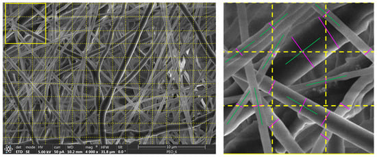 Example of SEM image analysis to measure diameters and orientation of fibers. The whole SEM image (left) and zoomed region are represented by the yellow square in the whole image with measurements (right). Yellow dashed lines represent the grid used to guide in the choice of fibers on which to perform measurements and green and magenta lines are examples of segments drawn to make measurements.