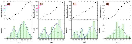 In order to better interpret these results, Table 3 gathers some parameters extracted from the distributions. For example, the average orientation angle per sample and tilt used to obtain the FESEM images, θT. As can be seen, regardless of the material, there is not any clear trend with the tilt angle; therefore, all angles measured per material were incorporated into a unique distribution (distributions shown in Figure 3) from which it was obtained a global average angle per sample (all tilts are included for the statistical calculation), <θ>, its corresponding standard deviation, σθ, and the maxima corresponding to the Gaussians, were used to deconvolute the orientation angles distributions, θmax, together with their widths and areas in brackets.