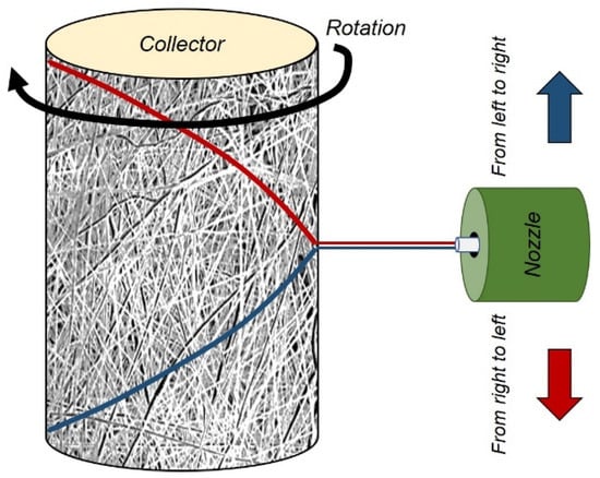 In principle, a bimodal distribution might be expected considering the way the fibers are collected. In Figure 5, a scheme that explains how bimodal distributions for fiber orientations are obtained is shown. The nozzle moves parallel to the long axis of the cylindrical collector which rotates following a perpendicular direction. Therefore, when the nozzle moves to the right, one range of angles for the fiber deposition on the collector will be favorable while, when the nozzle moves to the left the other range of angles would be favorable.