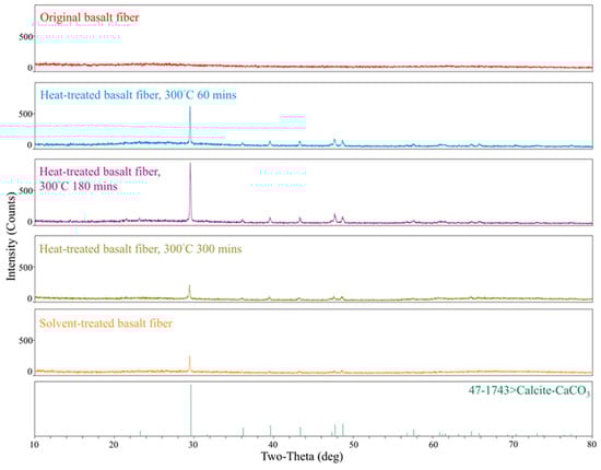 The XRD patterns of the different fibers are shown in Figure 7. The original basalt fiber specimens were amorphous, with no crystals or diffraction peaks present in the diffraction spectrum. This observation agrees with the analysis by Chakartnarodom et al. [51]. The XRD patterns of the heat-treated and solvent-treated basalt fibers showed a corresponding peak of 29.4° (2θ), indicating the presence of a crystalline phase of calcite (CaCO3, JCPDF-47-1743).