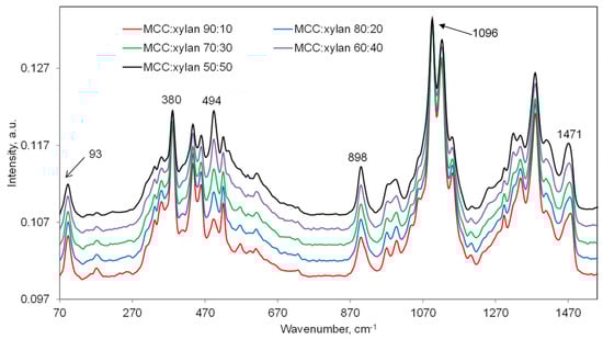 With an increased amount of xylan, while the intensities were greater at three locations (1460, 898, and 494 cm−1; Figure 3), they declined at many other band locations (1480, 1121, 1096, and 520 cm−1); these are all these wavenumber positions where MCC contributed strongly, and, for the 1121 and 1096 cm−1 bands, the implication was that any increased contribution from xylan (Table 2) was not enough to completely offset the decline caused by the reduction in MCC. A similar reduction was also noted for the 520 cm−1 band because there was only minimal contribution from the nearby xylan peak at 494 cm−1 (Table 2, Figure 1); therefore, for most of the samples, as the amount of cellulose in the sample declined, so did the intensity at 520 cm−1 (Figure 2 and Figure 3).