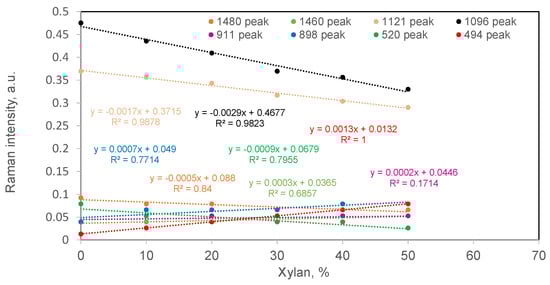 Cellulose/xylan mixtures (respective ratios of 90:10 to 50:50; Table 3) were prepared and analyzed using Raman spectroscopy. Judging by the mixture spectra in Figure 2, the main bands of xylan (1469, 1126, 1091, 900, and 494 cm−1; Table 2) overlapped with the cellulose features and modified their intensities to varying degrees. Therefore, for the mixture samples, peak intensity changes of the following eight bands of cellulose were evaluated: 1480, 1460, 1121, 1096, 911, 898, 520, and 494 cm−1 (Figure 1, Table 2). Because the intensity change is sample-composition-dependent, the percentage intensity change at a particular wavenumber (Table 3) was calculated using Equation (1), wherein the actual fraction of MCC present was factored in. In Figure 3, the calculated band intensity changes are plotted against the percentage of xylan in the samples, and, in most cases, good linear correlations (with an R2 between 0.69 and 1.0) were obtained. This means that the change in the xylan content accounted for a substantial amount of the variance in the MCC band intensities. However, the 911 cm−1 band intensity showed a poor correlation (R2, 0.17, Figure 3), which may be related to the fact that while both cellulose and xylan weakly contribute in this case (Table 2), only the falling wing of xylan’s band at 900 cm−1 influences the intensity at 911 cm−1 (Table 2, Figure 1).