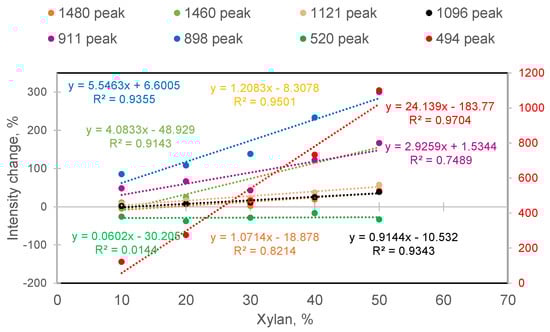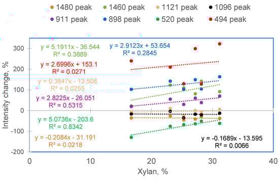 In Figure 10, % intensity changes in the spectra of the fibers are plotted based on Equation (1), wherein these changes are calculated relative to the delignified-flax cellulose content instead of MCC (Table 4). Although, as expected, with an increasing xylan content, the %-intensity-changes increased at 1460, 911, 898, and 494 cm−1 (ΔI494 > ΔI898 > ΔI1460 > ΔI911); for these bands, the linear regression was not good (R2 between 0.03 to 0.53; Figure 10). Presently, there is no explanation for this; however, differences between the fibers—not only between the supramolecular structures of celluloses but also between xylan’s chemical structures []––are two potential explanations. A poor linear correlation with increased xylan content was also seen for the bands at the 1480, 1121, and 1096 cm−1 peaks (with an R2 between 0.007 and 0.026, Figure 10). The reason for this is likely to be that, with an increased xylan content, the intensity changes at these locations are low, as was observed earlier in the case of the MCC–xylan mixtures (Figure 4 and Table 3). Lastly, compared to delignified flax, as expected, the 520 cm−1 peak’s intensity was lower in all cases because less cellulose was present. Nevertheless, with an increased amount of xylan, the extent of the decline was reduced (Figure 10). The explanation for this seems to be that there is a tailing contribution appearing at 520 cm−1 from the neighboring xylan peak at 494 cm−1 (Figure 9).