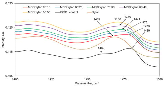 The other point to note is that in the region where the spectral features of the sample components significantly overlap, the band position of the mixture sample can undergo a shift. Usually, the shift depends upon both the initial intensities of the bands involved and the sample composition. This phenomenon is illustrated in Figure 5, where the 1400 to 1500 cm−1 region spectra of various mixture samples along with those of the two components (MCC and xylan) are shown. As can be noted, due to the band overlap, the pure MCC peak, originally located at 1480 cm−1, shifted to lower wavenumbers. In the case of the cellulose/xylan 50:50 sample, the peak shifted by 8 cm−1.