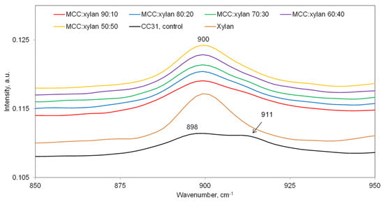Another example of band overlap can be seen in the 900 cm−1 region, where MCC has two peaks (898 and 911 cm−1, Figure 6) and xylan only has one at 898 cm−1. Although the MCC shoulder at 911 cm−1 is still perceptible at a low xylan level (e.g., the MCC/xylan 80:20 sample), it fades at higher xylan levels (Figure 6). Moreover, contrary to the 1450–1550 cm−1 region situation that was discussed above, no significant shift in the 898 cm−1 MCC peak was observed because this peak is common to both MCC and xylan, and the MCC feature at 911 cm−1 is quite weak.