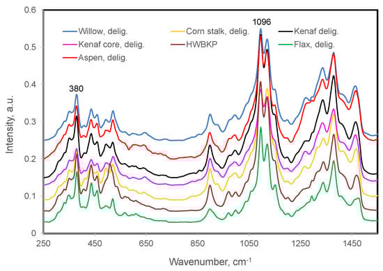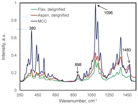 Raman spectra of MCC, delignified aspen, and delignified flax.