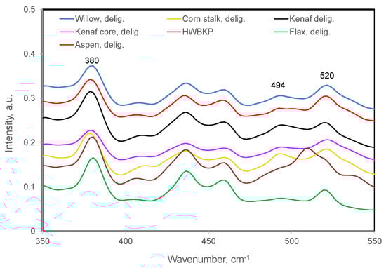 Considering the Table 4 intensity data, for the non-MCC samples, the I1480 data are similar, and small variations among the low- and high-xylan samples (Table 1) can be understood in terms of the (a) xylan contributions at 1480 cm−1 (Figure 5) and the fact that (b), in higher cellulose samples, a greater contribution is made by cellulose (i.e., delignified flax and HWBKP, Table 1 and Table 4). Next, considering the I1460 data, the intensities for flax and HWBKP were lower than the rest of the fiber samples. This is likely to be because between the two bands of MCC at 1480 and 1460 cm−1, the latter is significantly weaker (Figure 5), and even though these two samples have higher amounts of cellulose, this fact does not fully compensate for the lower amount of xylan, which also contributes here (Figure 5). However, in the rest of the fiber samples, compared to flax, xylan’s contribution at 1460 cm−1 is higher. In contrast, in the fibers, the Raman intensities I1121 and I1096 did not vary all that much; therefore, at these wavenumbers, the contributions from cellulose are predominant. The other bands in the fibers’ spectra (Figure 8) that showed higher Raman intensities when a significant amount of xylan was present were 911, 898, and 494 cm−1 (Table 4). Compared to delignified flax (1.34% xylan, Table 1), the I911, I898, and I494 were higher by at least 1.5, 1.7, and 3 times, respectively (Table 4). As mentioned above, such increases are in accordance with the prediction (ΔI494 > ΔI898 > ΔI911 > ΔI1460 > ΔI1480, Table 3) that was based upon the analysis of the MCC and xylan mixtures (Figure 4). The highest increase was observed at 494 cm−1 (Figure 9, Table 4), which is in accordance with the expectation that, in the Raman spectrum of xylan, this is one of the strongest peaks (Figure 1, Table 2).
