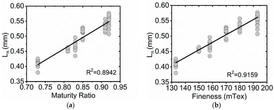 A range of Ln and LW mean length values are observed for the six cotton microfiber samples and the rayon standard as calculated by the FQA system using Equations (1) and (2) as described in the FQA instrument manual. The rayon length determinations from the FQA are comparable to the values of the standard reported by its manufacturer: 0.53 ± 0.02 mm and 0.55 ± 0.02 mm for Ln and LW, respectively. While all cotton microfiber samples were prepared using the same Wiley mill mesh, and dispersed through the same standard sieve, the average recorded length varied in a range from 0.41 to 0.55 mm. Bivariate statistical analysis are summarized in Table 3. Ln showed a strong positive correlation to maturity ratio and fineness, also displayed in Figure 1a,b. Strong negative correlations were observed for IFC and SFC(w). Comparison to L(w) also showed a strong positive correlation. Only UQL(w) showed a reduced correlation to Ln. A combination of these fiber characteristics likely explains the range of microfiber lengths seen for the microfiber samples by the FQA system; shorter, finer, more immature fibers are fragmented into smaller microfibers and more easily pass through the Wiley mill mesh, reducing their mean length measurements.