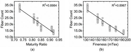 Bivariate plots of fiber counts values for six cotton standards (FQA) versus maturity ratio and fineness determinations (AFIS). (a) Fiber count as a function of maturity ratio for 90 sonicated cotton microfiber suspensions. (b) Fiber count as a function of fineness for 90 sonicated cotton microfiber suspensions. A linear fit (black trace) is displayed in each plot.