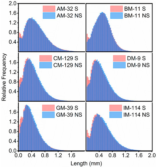 Relative distribution of microfiber length (Ln) values for six cotton standards as measured with the FQA instrument: AM-32 (top left), BM-11 (top right), CM-129 (middle left), DM-9 (middle right), GM-39 (bottom left), and IM-114 (bottom right). Each relative distribution displays the length (Ln) measurements observed for 15 microfiber samples (2 mg) that were sonicated prior to examination (light red histograms) or without sonication (light blue histograms). The darker blue histogram columns represent areas of overlap between the sonicated and non-sonicated distributions.