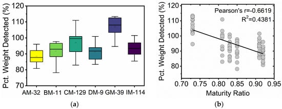 (a) Box plot analysis depicting the percent weight detected for the six cotton microfiber standards. (b) Percent weight detected as a function of the maturity ratio for 90 sonicated cotton microfiber suspensions.